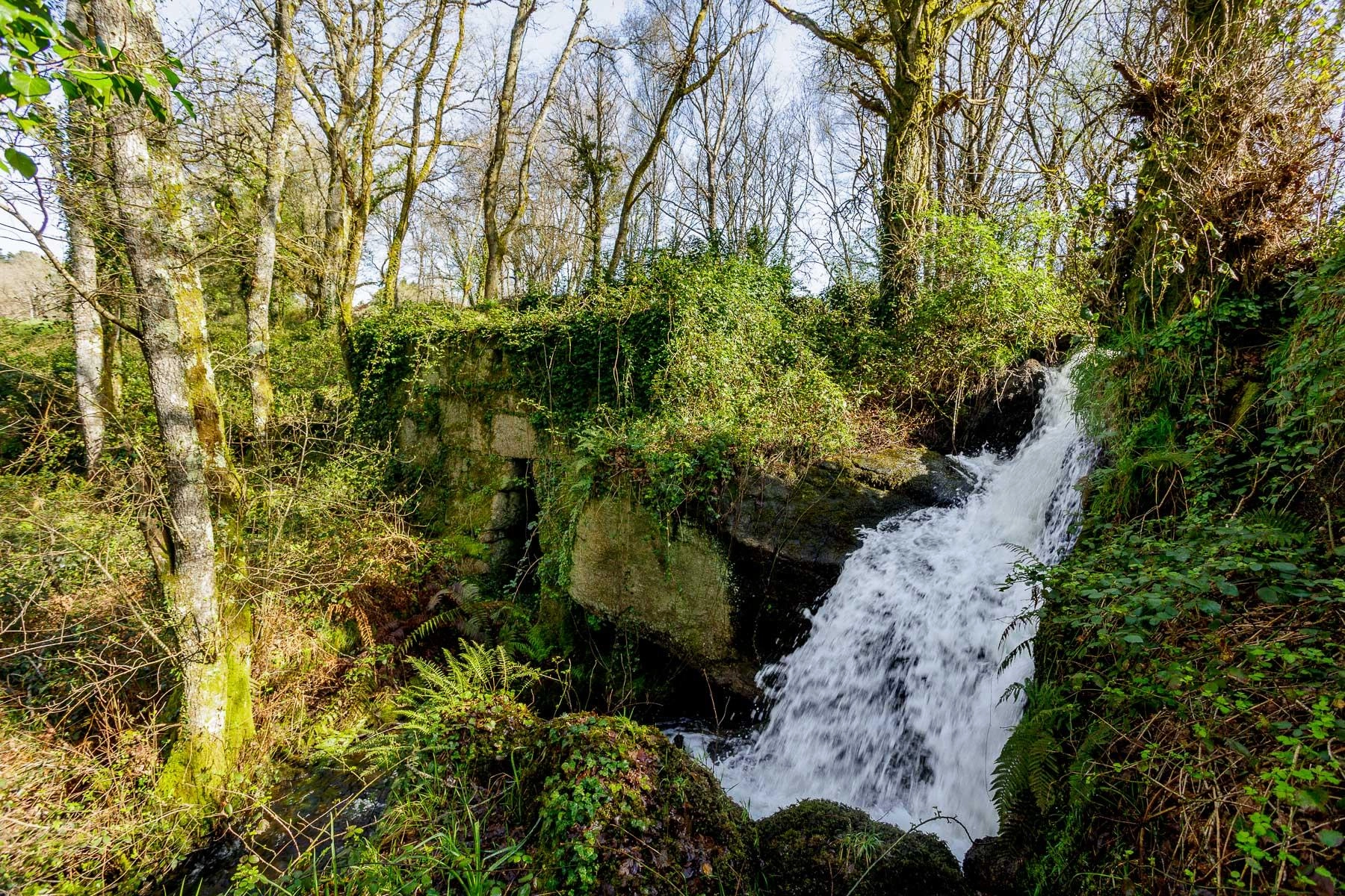 La cascada natural que alimentaba el molino crea un entorno de extraordinaria belleza, rodeada de bosque de ribera con vegetación autóctona que incluye helechos, musgo y especies caducifolias características del clima atlántico.