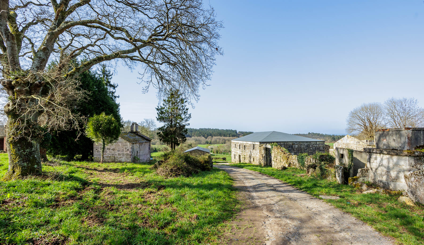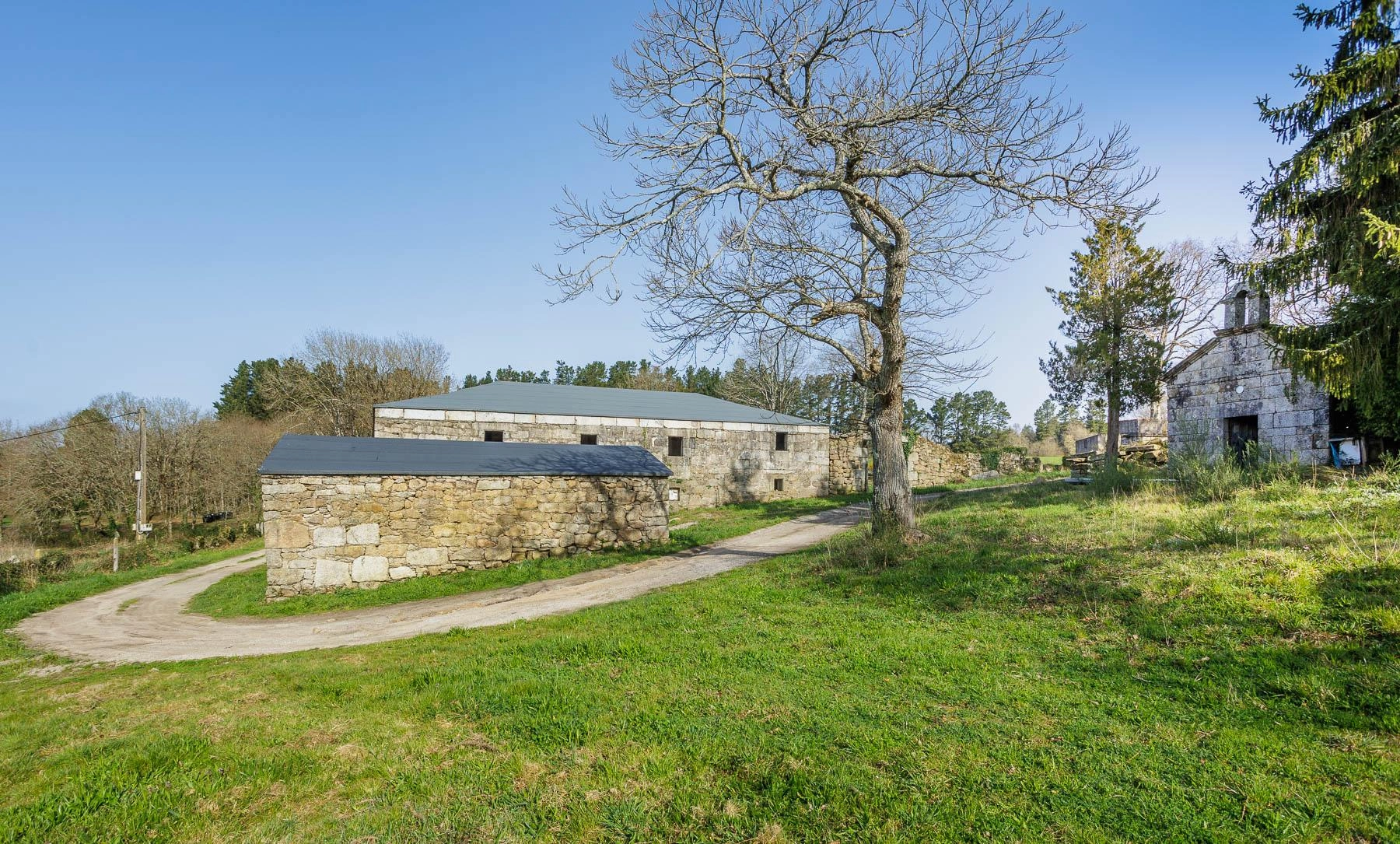El complejo se compone de múltiples construcciones que testimonian más de dos siglos de historia rural gallega. La casa principal de 570 m² distribuida en dos plantas conserva sus muros de sillería y se encuentra en proceso de rehabilitación avanzada, con estructura asegurada y la armadura del tejado ya instalada con madera noble de castaño.