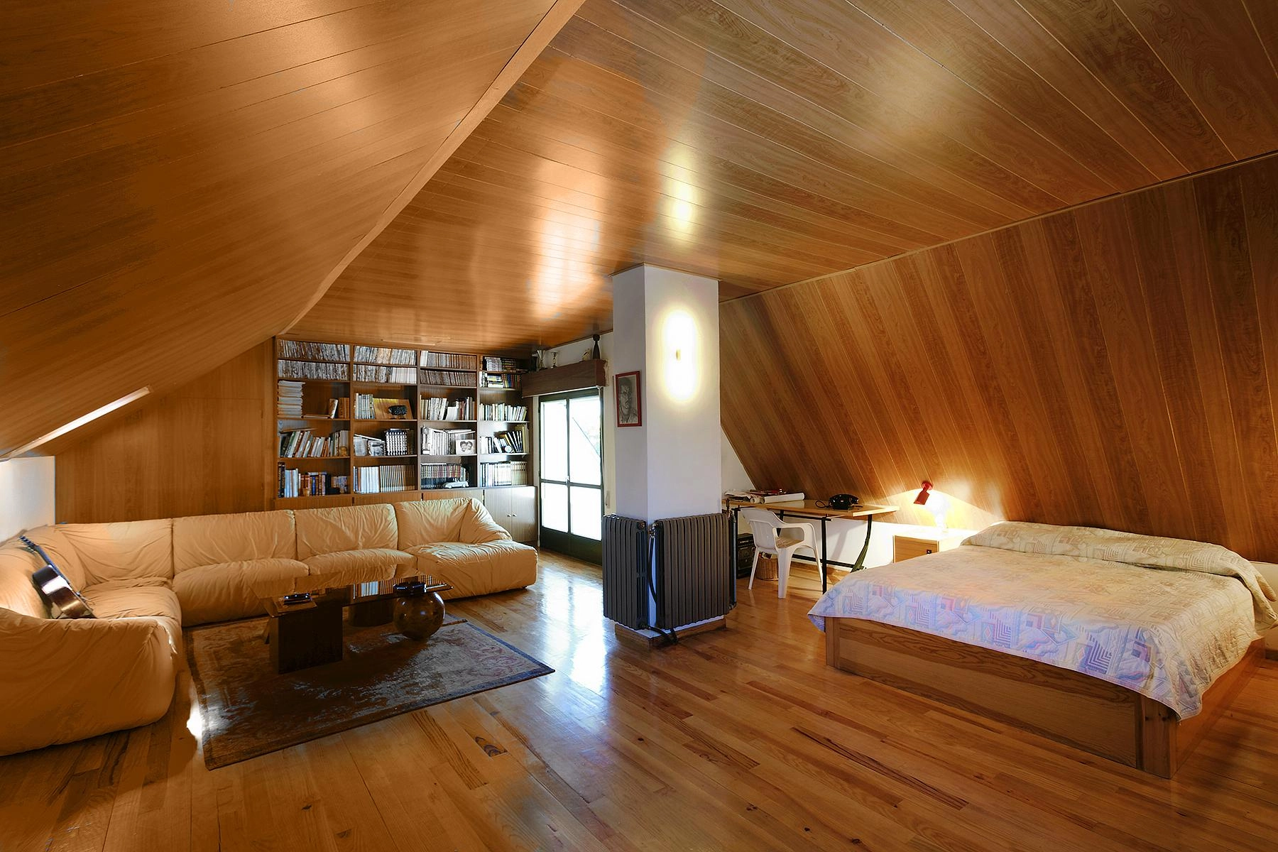 La bajocubierta acoge una impresionante habitación con techos de madera vista, zona de estar, biblioteca y área de trabajo, creando un espacio multifuncional y acogedor.