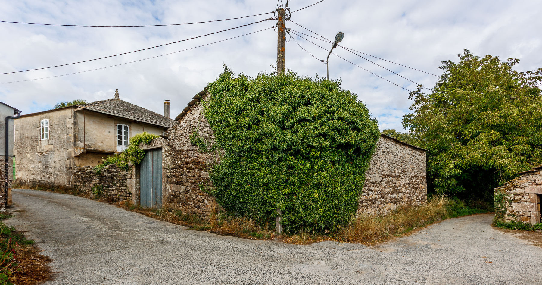 El conjunto arquitectónico destaca por su forma cuadrada tradicional, construido con los materiales autóctonos gallegos: piedra de mampostería, madera y pizarra. La propiedad incluye un espacioso patio interior que actúa como nexo entre todas las construcciones, un hórreo gallego tradicional perfectamente conservado y un alpendre de piedra con horno de leña que completa este auténtico testimonio de la vida rural.