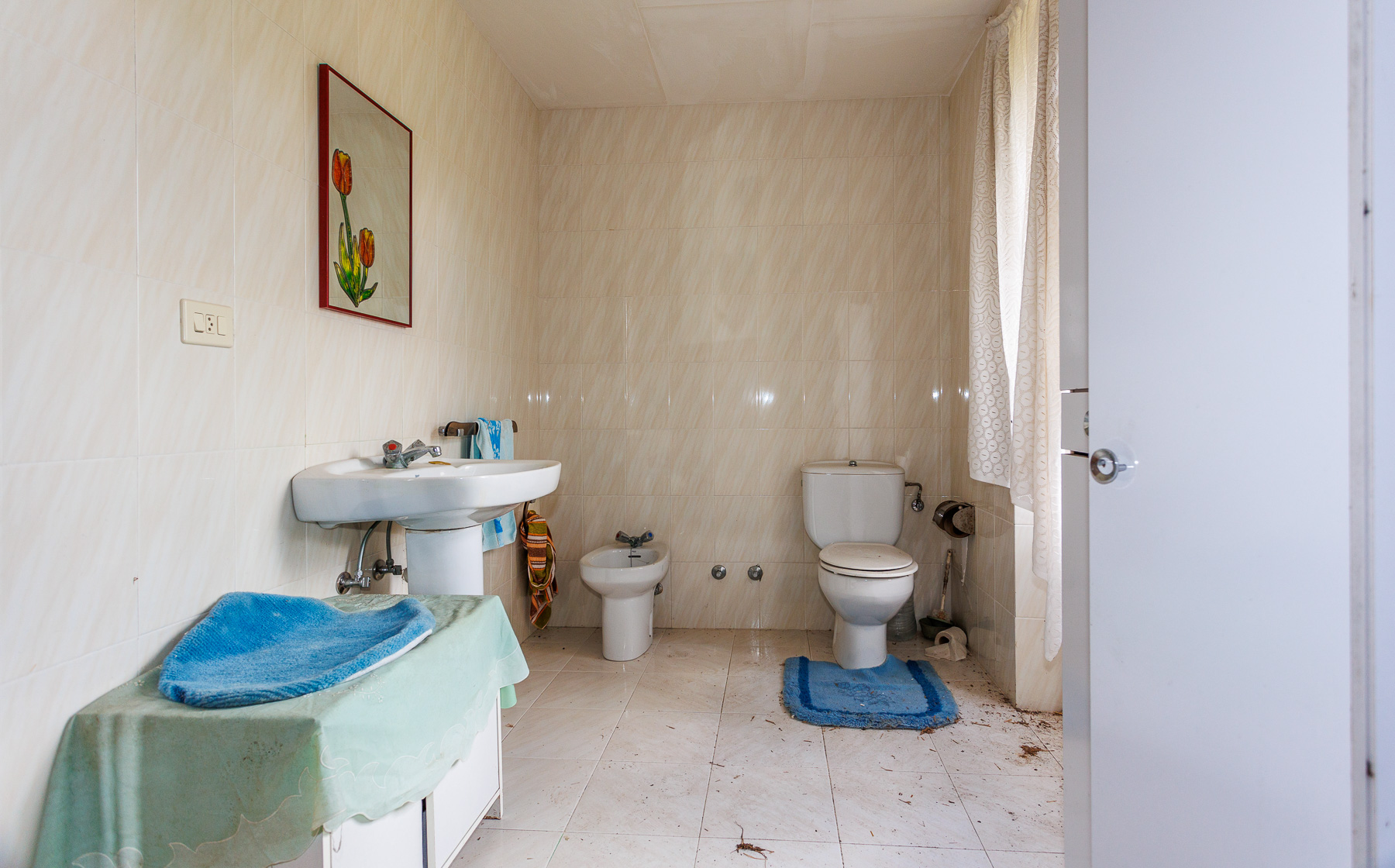 La planta baja conserva los espacios originales de las antiguas cuadras y cocina tradicional, donde una cocina bilbaína de leña con azulejos decorativos y compartimentos de obra evocan la vida rural de antaño. Aunque estos espacios esperan restauración, ofrecen múltiples posibilidades de rehabilitación para crear amplias zonas de día.