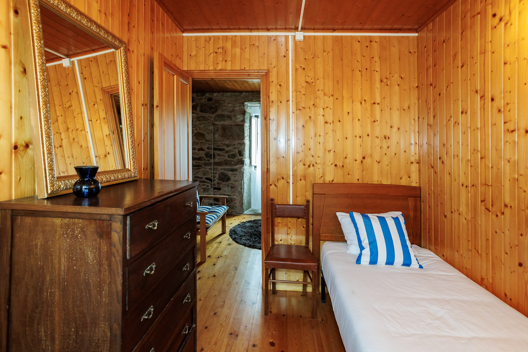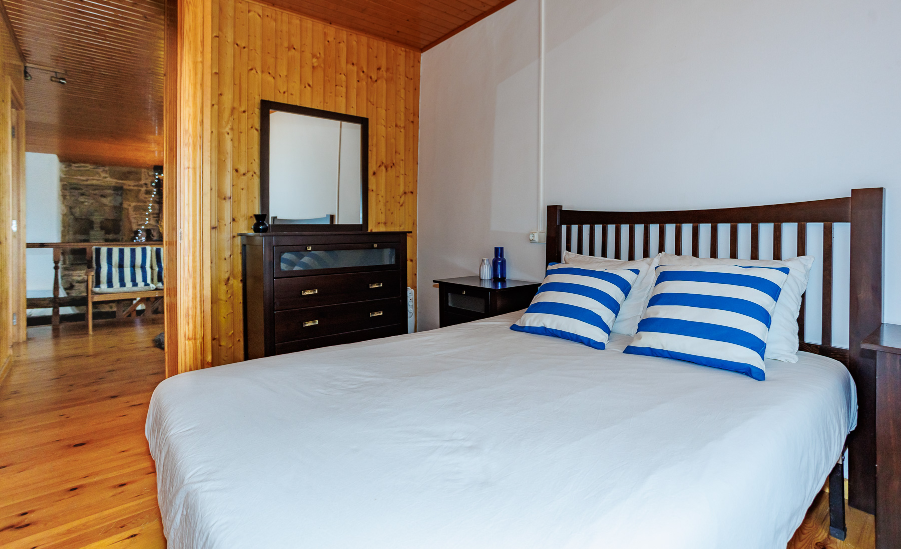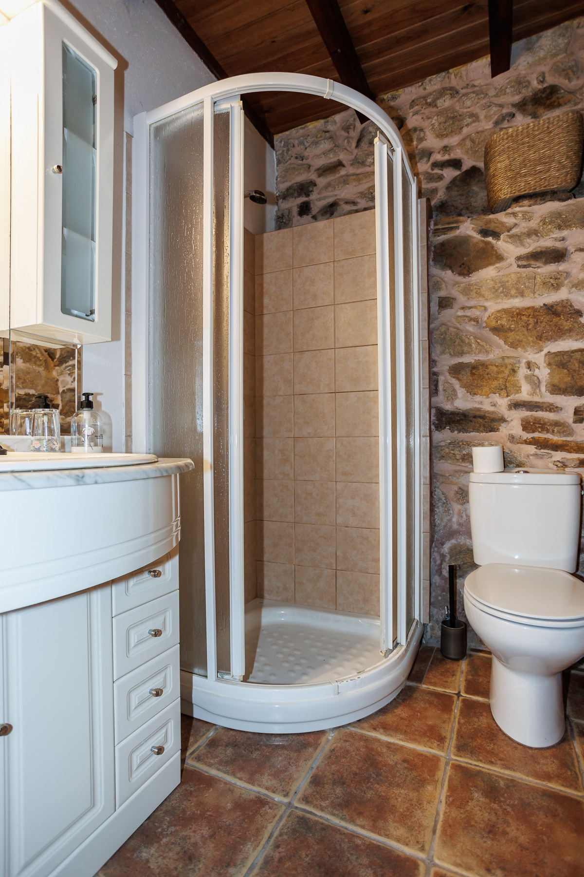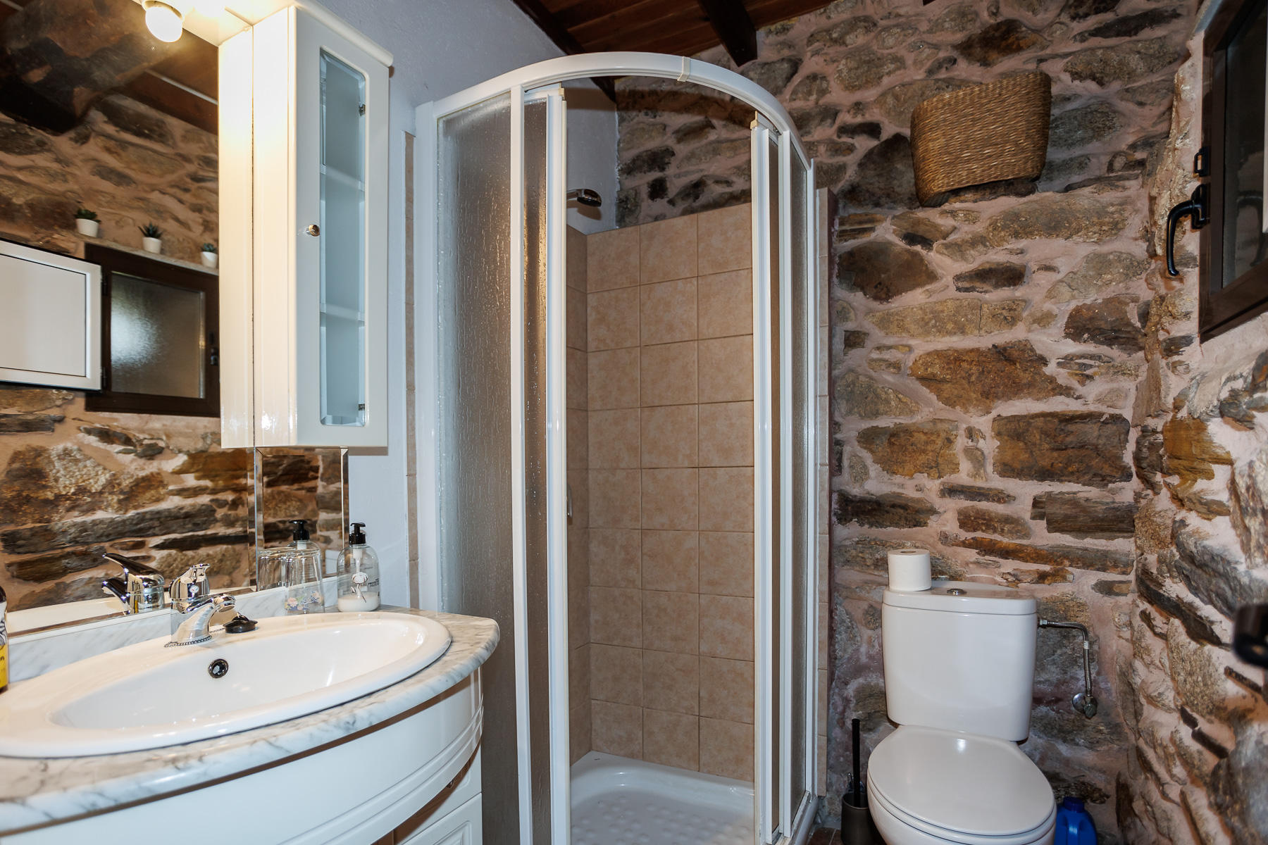 La vivienda principal es una casa de piedra de dos plantas que ha sido completamente restaurada conservando todos los elementos tradicionales. En la planta baja, un espacio diáfano integra cocina-salón-comedor con lareira tradicional, pila original de piedra y cuarto de baño completo. Los muros de piedra vista, vigas de madera en el techo, suelo de pizarra y la escalera de madera tradicional crean ambientes cálidos y llenos de carácter.