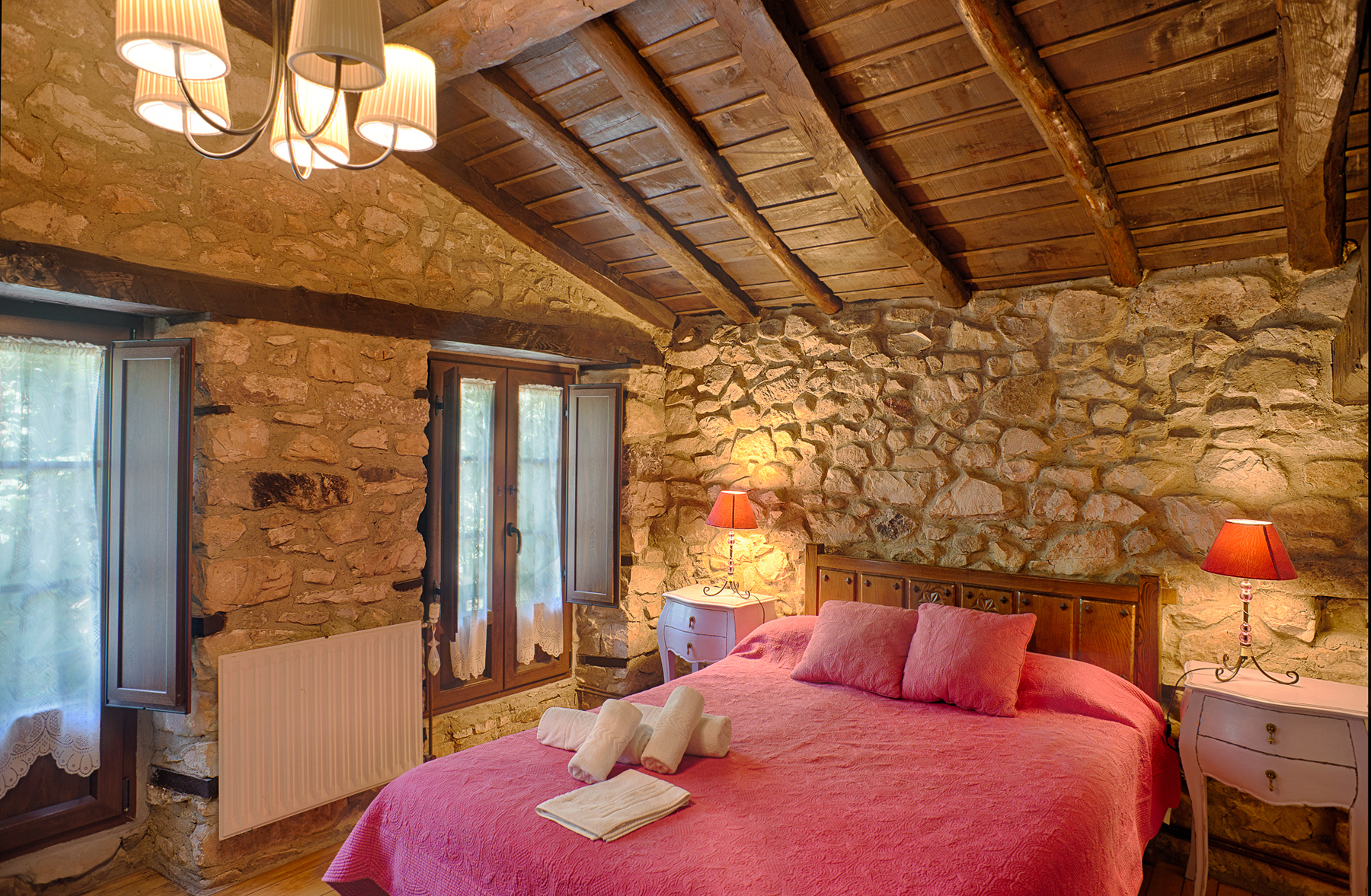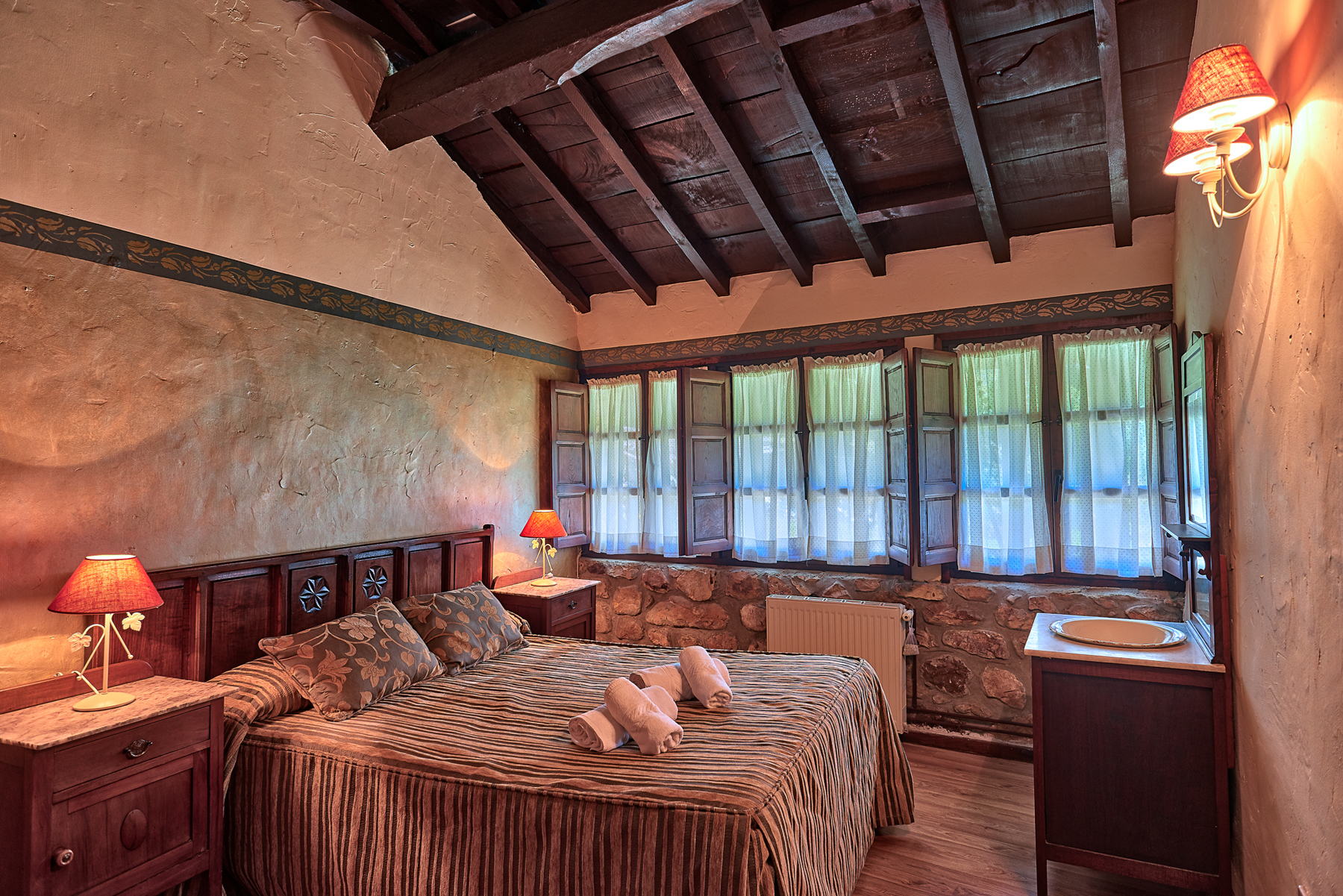 Las habitaciones conservan elementos arquitectónicos originales como techos con vigas de madera vista, muros de mampostería de piedra y suelos de baldosa y de madera, ofreciendo espacios únicos que atraen al turista más exigente. Todas las habitaciones disponen de cuarto de baño completo, televisión de pantalla plana, armarios empotrados y calefacción. Algunas cuentan con vestidor o cama supletoria para niños, proporcionando una capacidad para 29 personas.