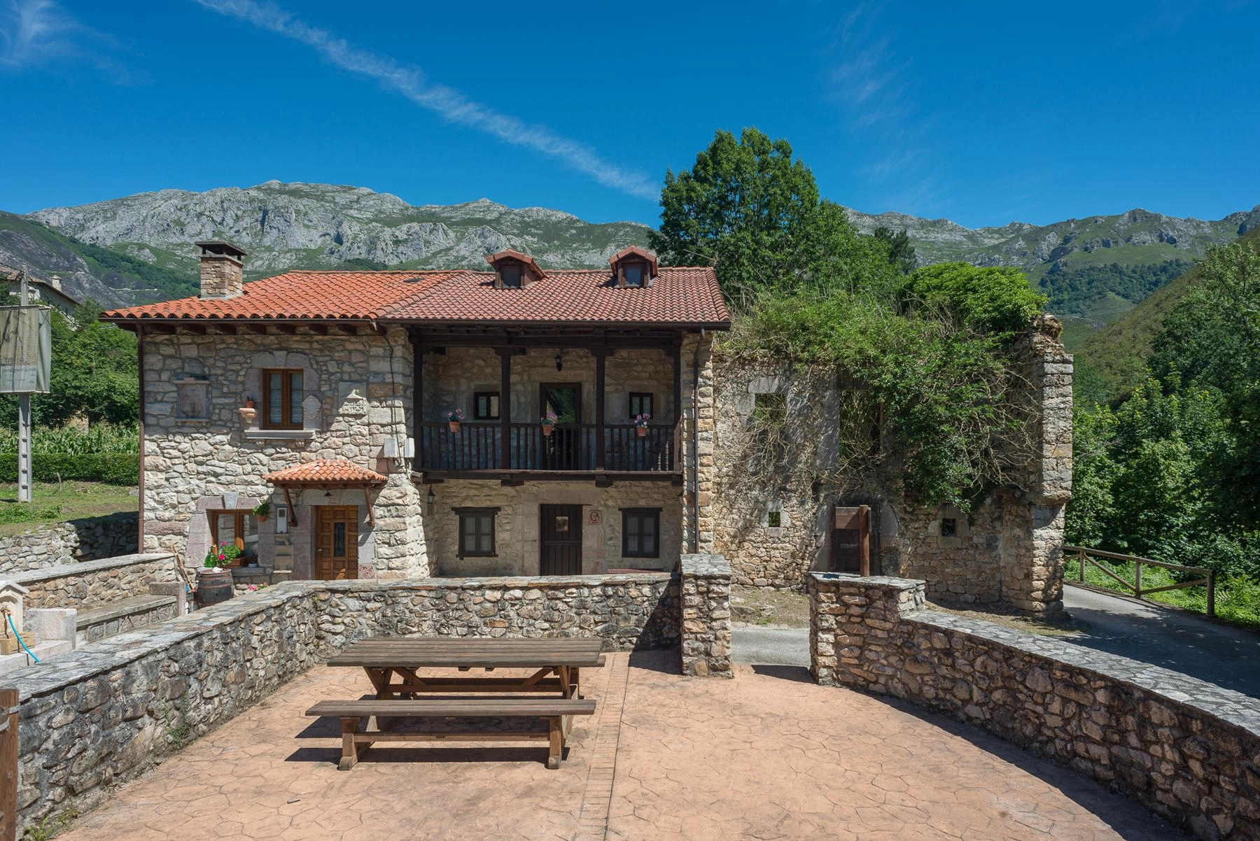 El conjunto arquitectónico, que antiguamente funcionaba como tahona o horno comunitario, ha sido rehabilitado con esmero respetando la arquitectura tradicional asturiana. La propiedad abarca 7.197 m² de terreno y cuenta con 1.423 m² construidos distribuidos en múltiples espacios y varias construcciones, integrándose perfectamente con el paisaje montañoso de la Sierra del Cuera.