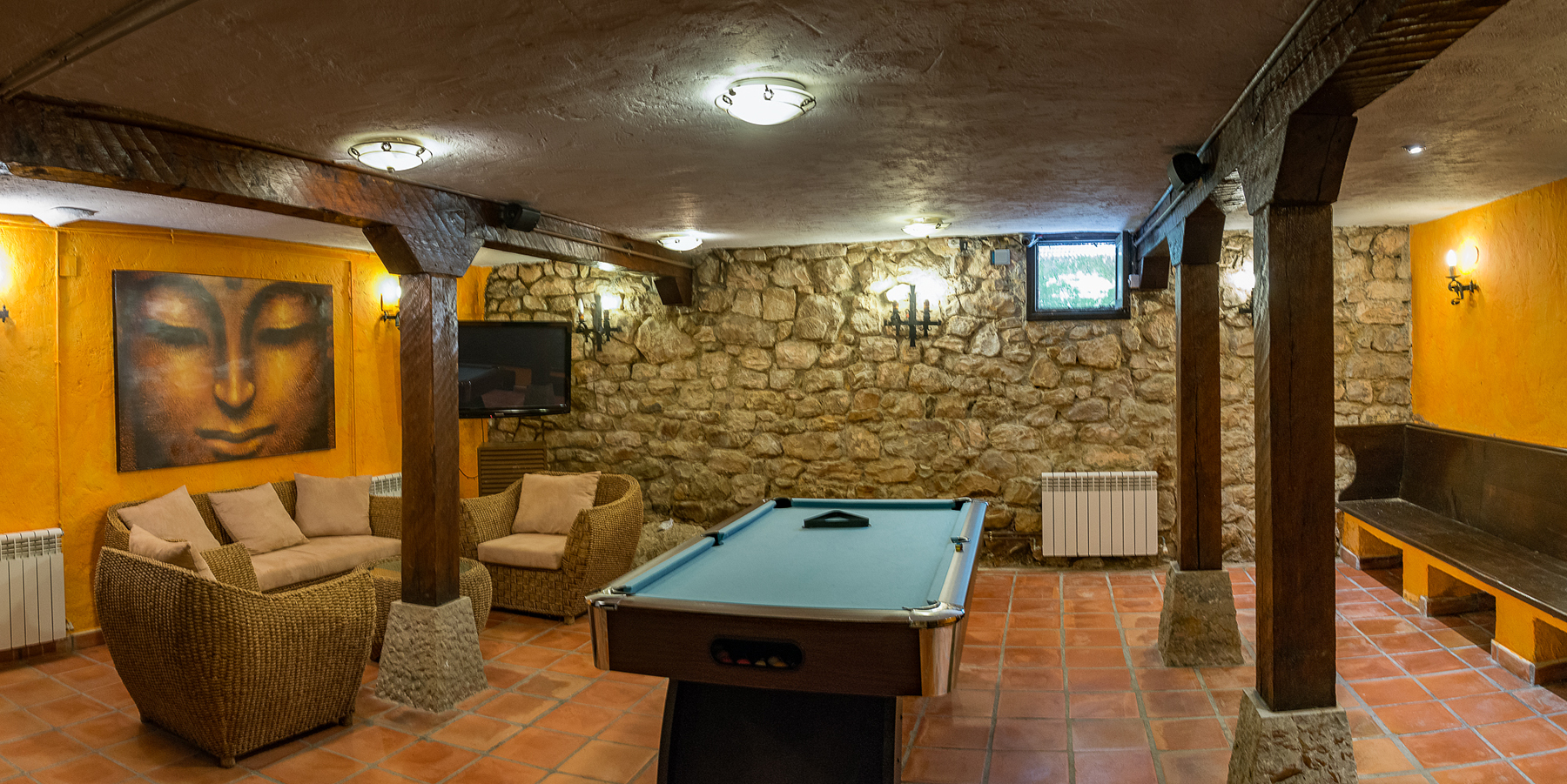 Las zonas comunes se completan con bar, sala de estar, y una sala de juegos con billar, futbolín y libros de lectura. En el exterior, múltiples terrazas pavimentadas con piedra natural se distribuyen en diferentes niveles, ofreciendo espacios adicionales para el desarrollo de la actividad hostelera en contacto directo con la naturaleza.