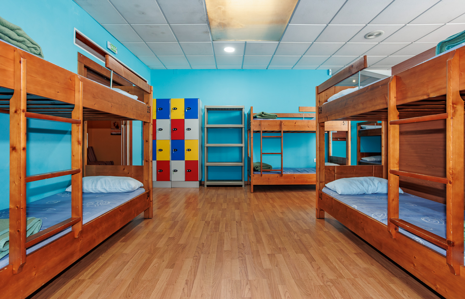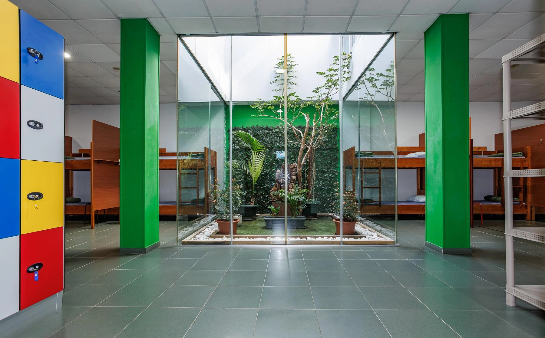 Todas las literas están hechas a medida en madera de pino, garantizando durabilidad y confort. Los dormitorios presentan acabados modernos, paredes en colores alegres y taquillas individuales para cada huésped. Un singular jardín interior cerrado por cristalera aporta luz natural y crea un ambiente único en una de las zonas de descanso.