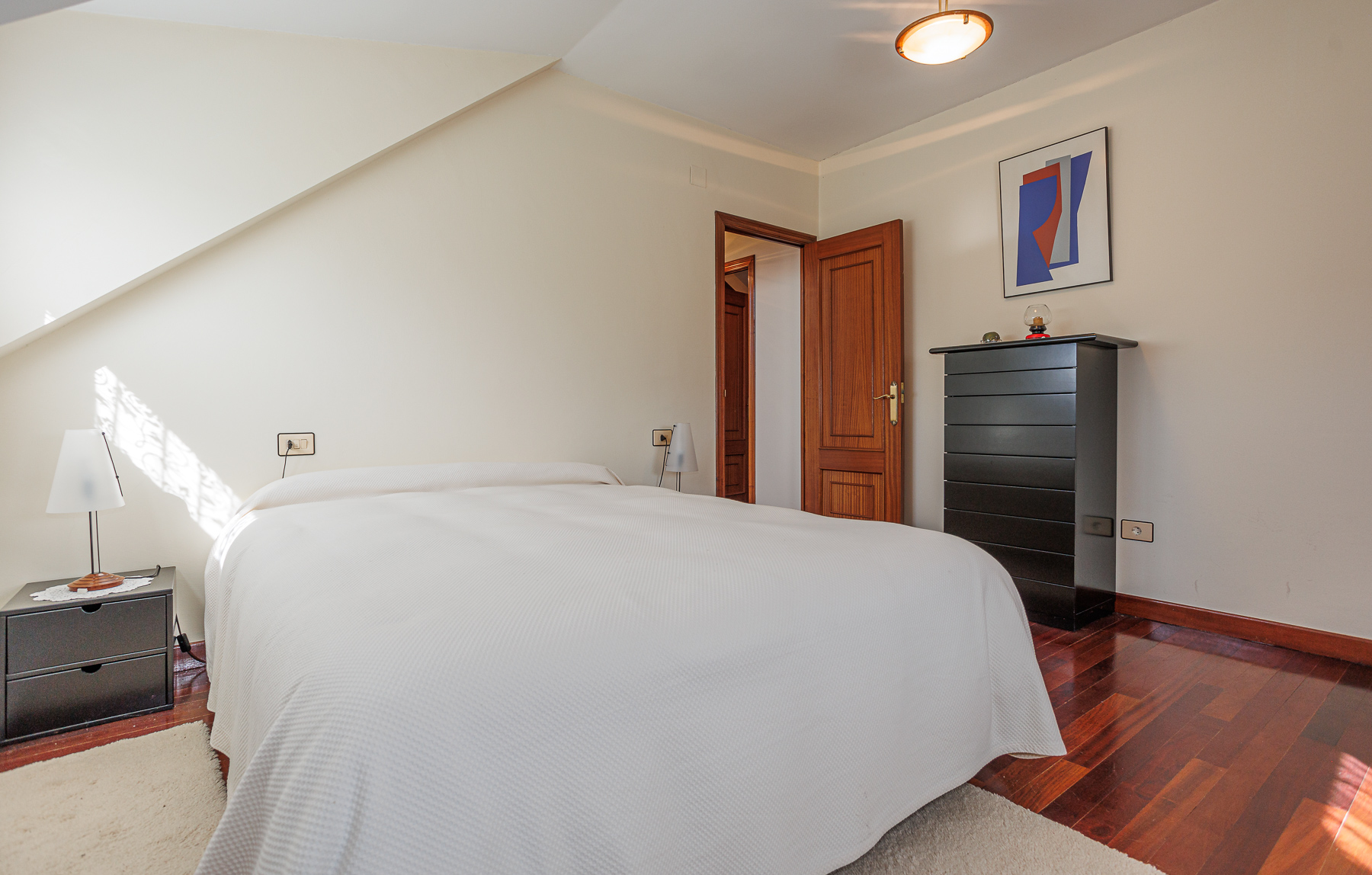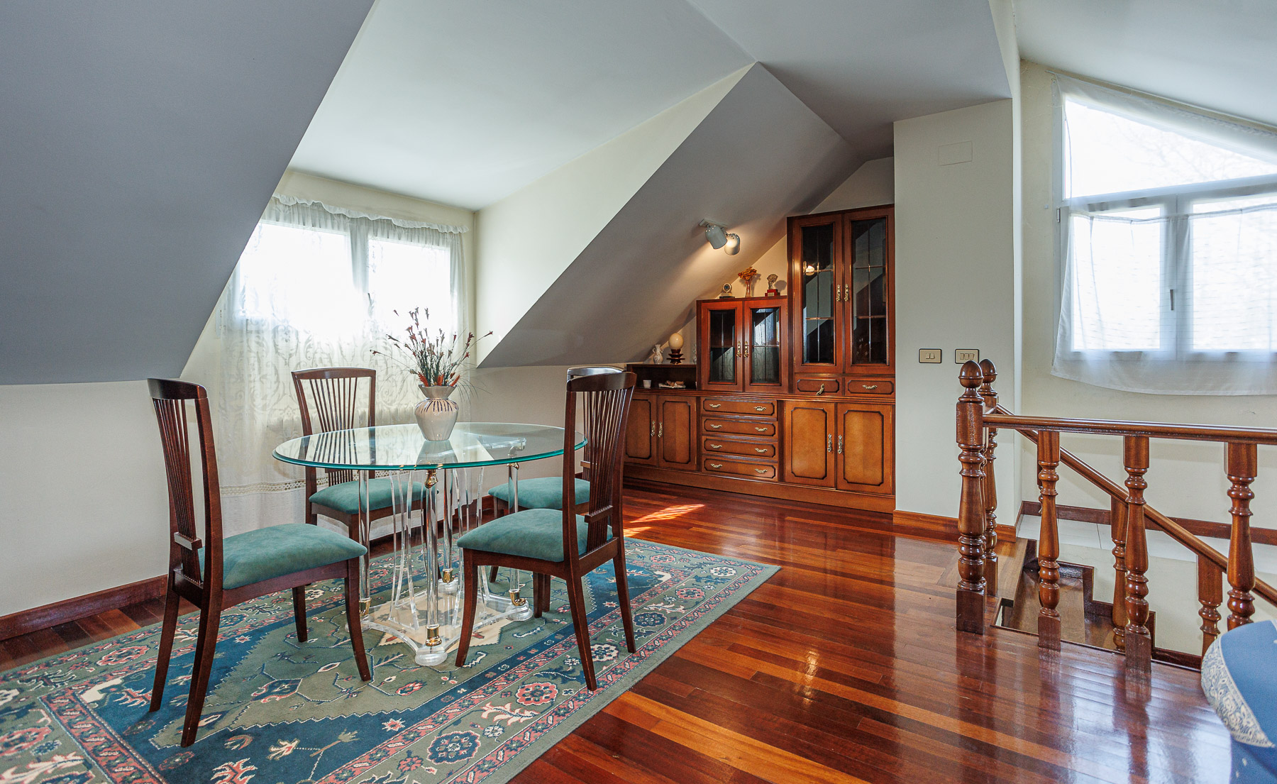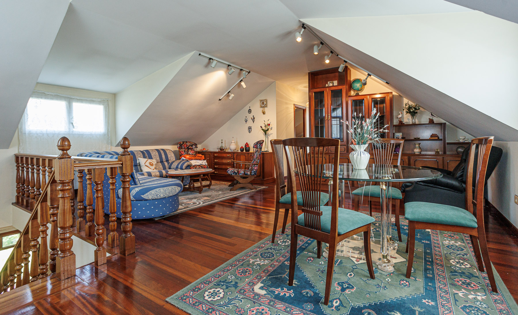 La planta superior sorprende con un gran salón de techos inclinados con iluminación moderna, zona de estar y comedor. Este nivel también alberga dos dormitorios adicionales y un segundo cuarto de baño.