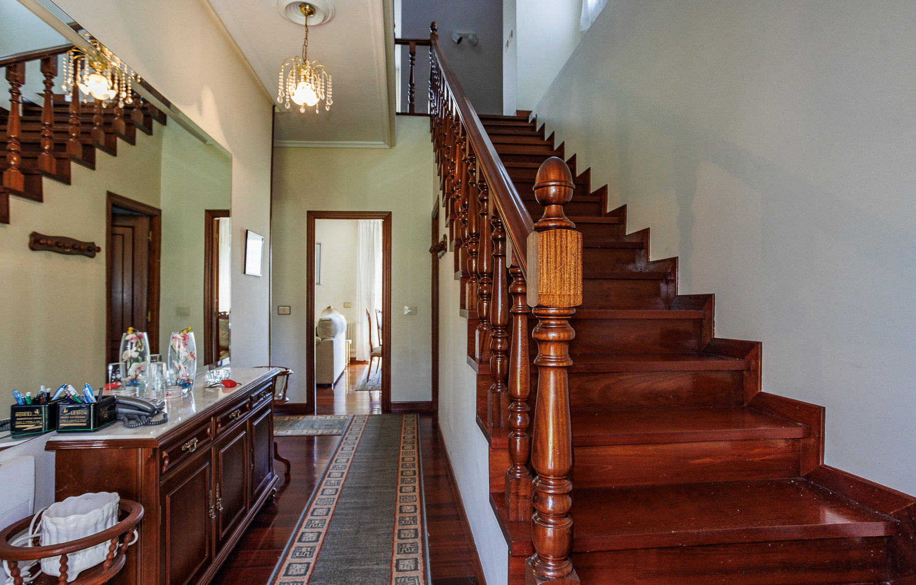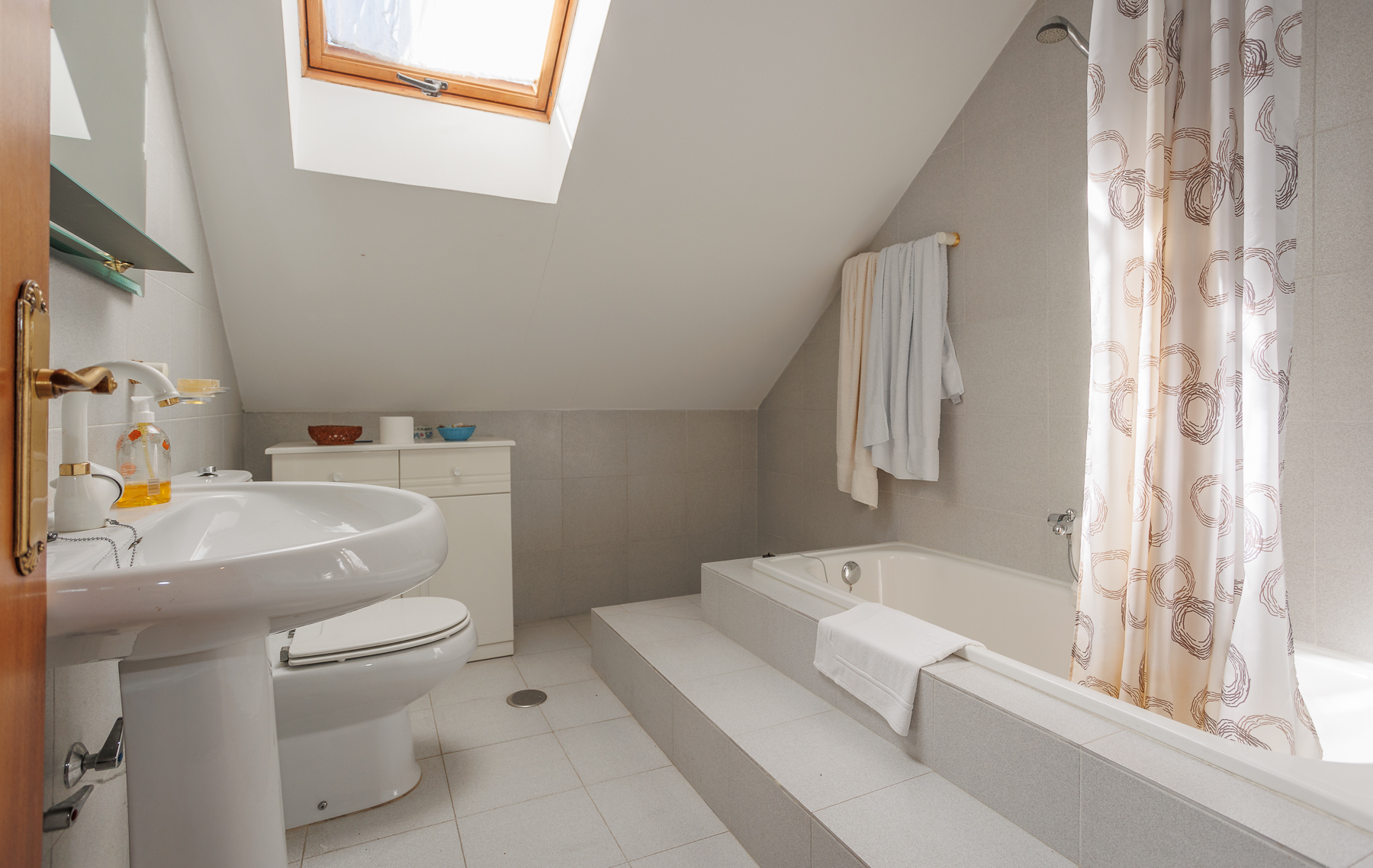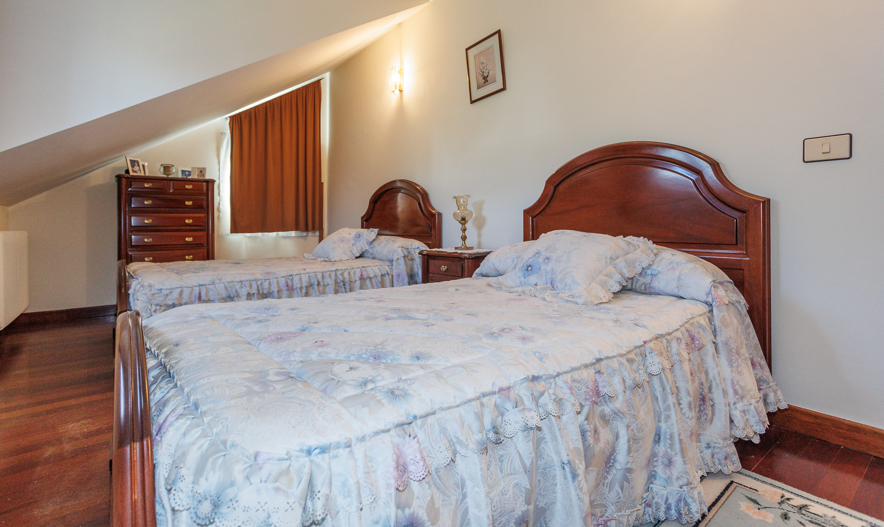 La planta superior sorprende con un gran salón de techos inclinados con iluminación moderna, zona de estar y comedor. Este nivel también alberga dos dormitorios adicionales y un segundo cuarto de baño.