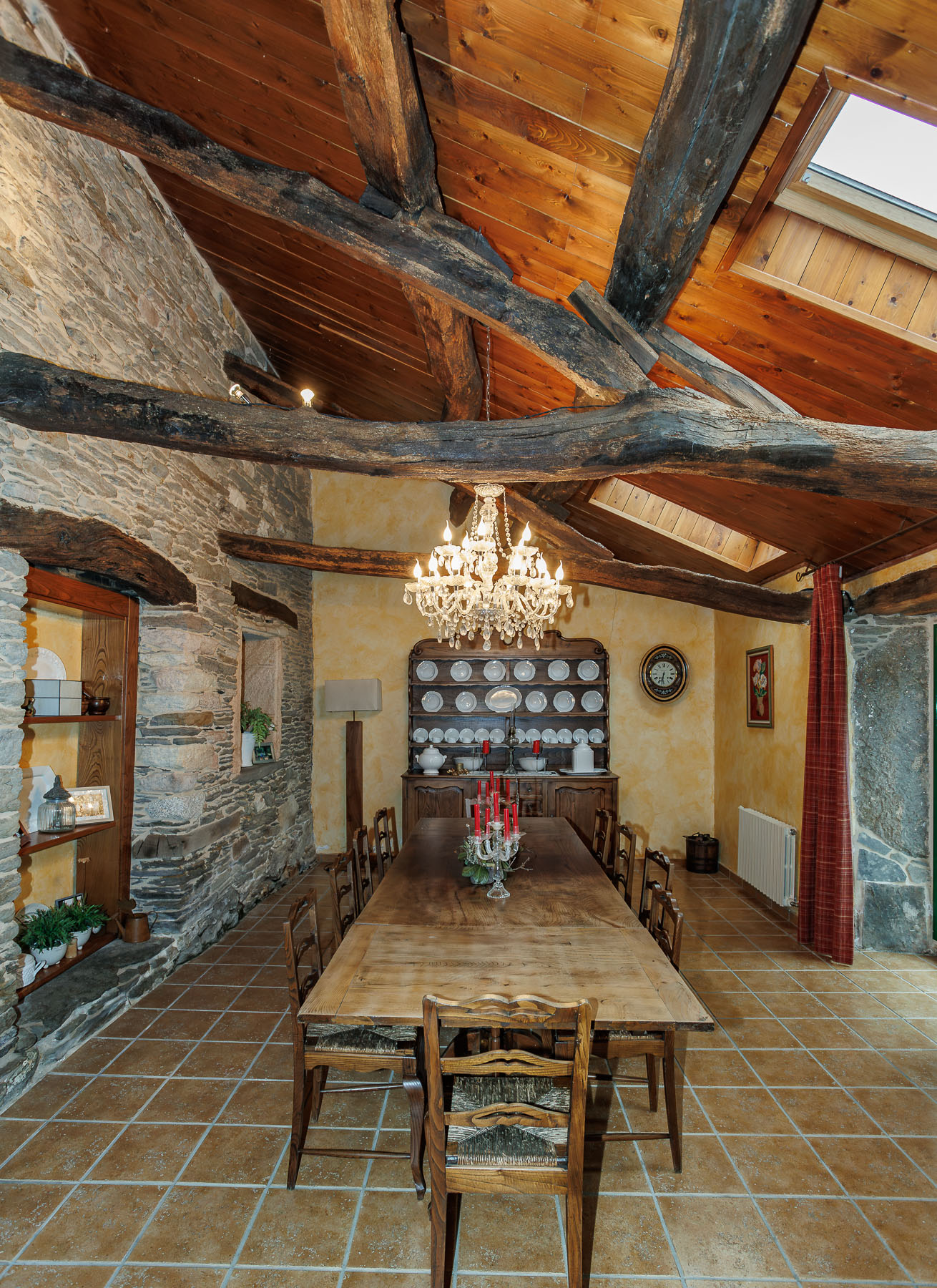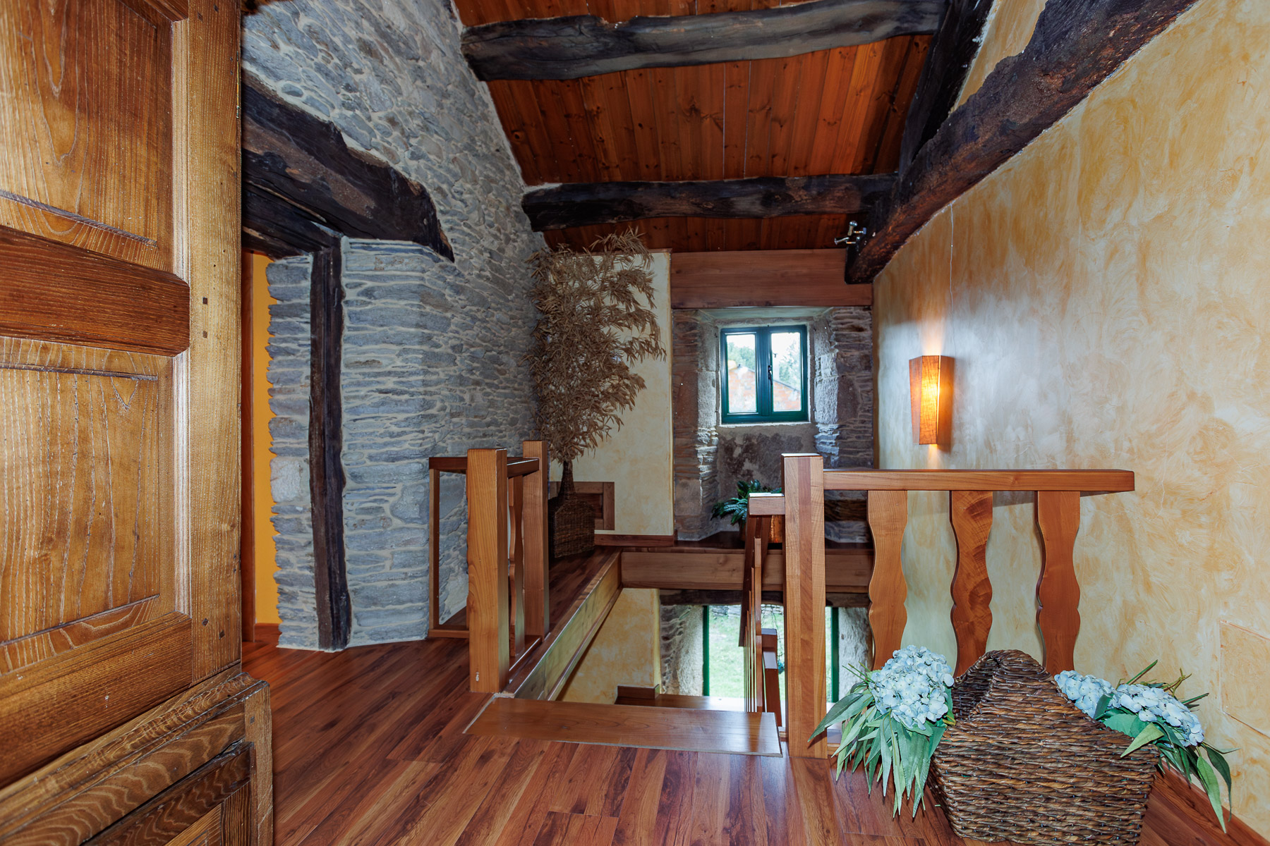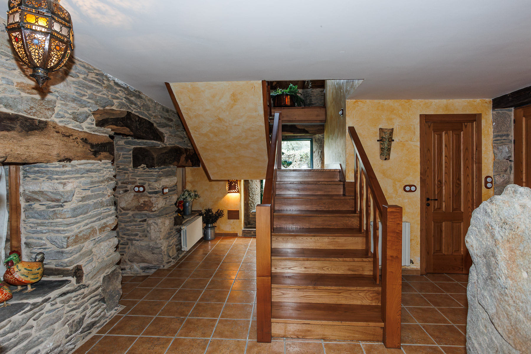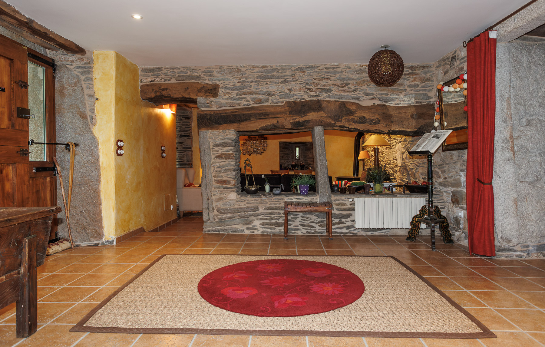 La vivienda principal destaca por su restauración ejemplar que combina elementos arquitectónicos tradicionales con acabados modernos de primera calidad. Los muros de piedra, las vigas de madera vista y los suelos de cerámica y tarima crean ambientes cálidos y acogedores en todas las estancias.