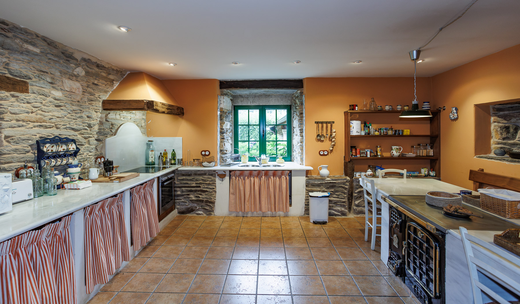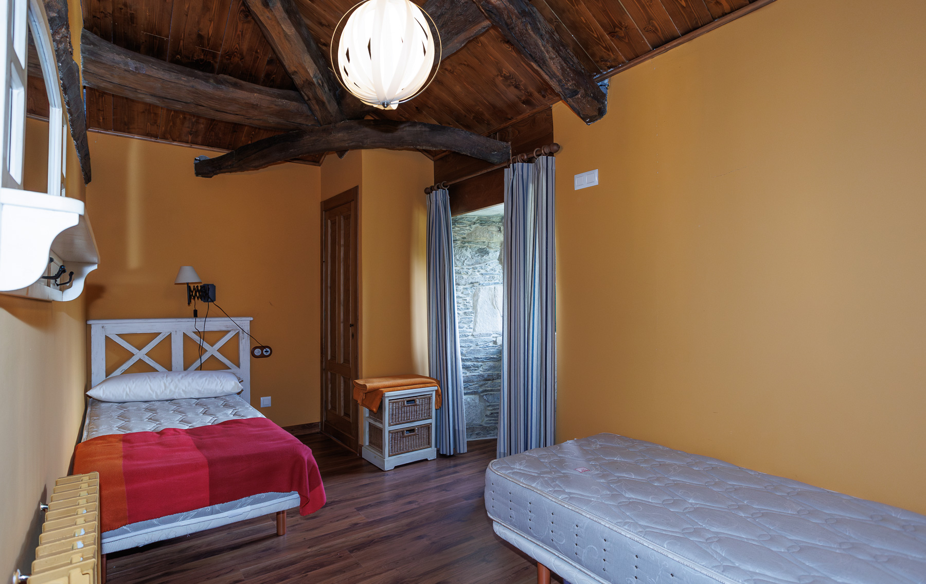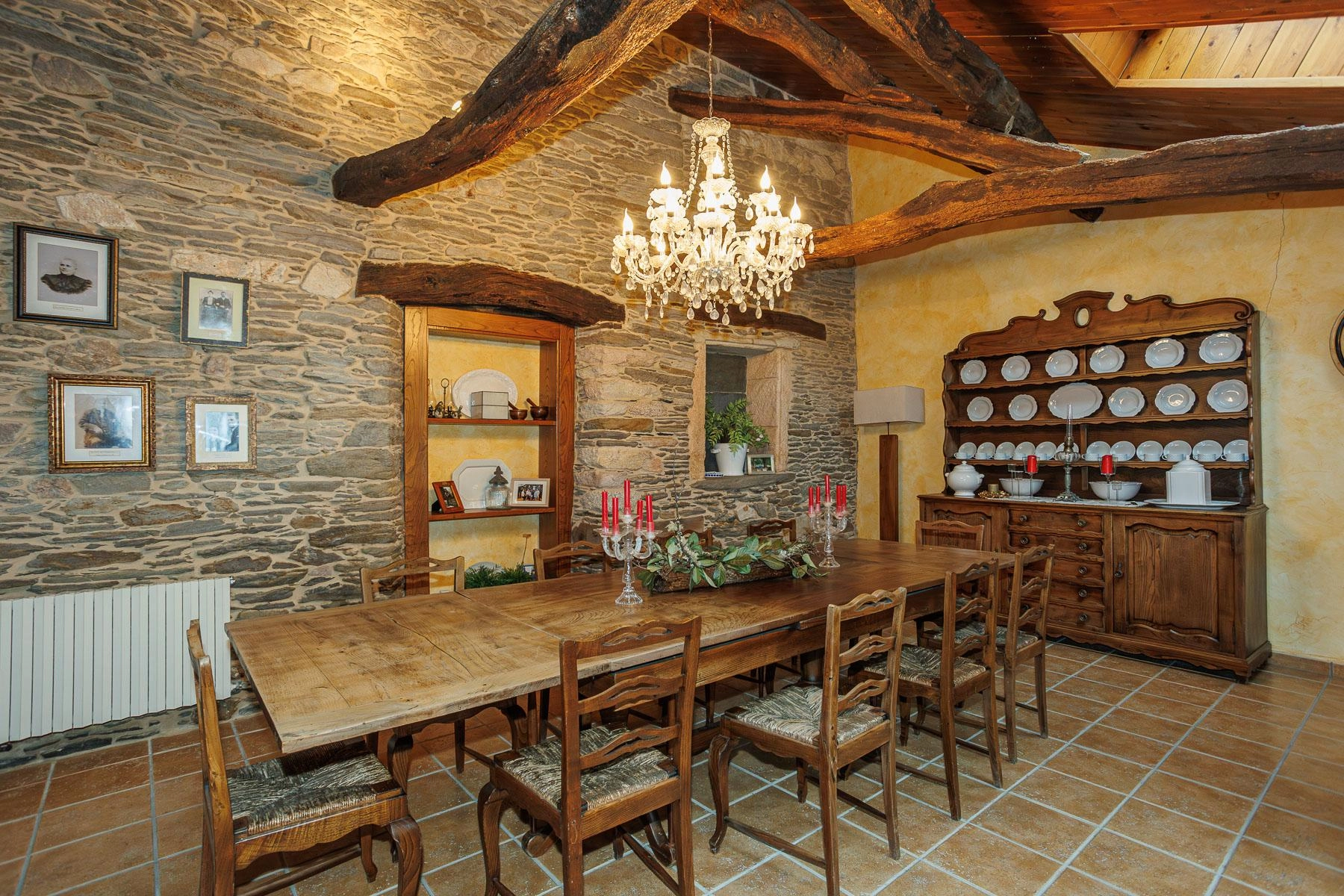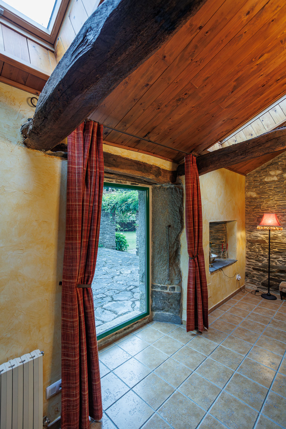 La vivienda principal destaca por su restauración ejemplar que combina elementos arquitectónicos tradicionales con acabados modernos de primera calidad. Los muros de piedra, las vigas de madera vista y los suelos de cerámica y tarima crean ambientes cálidos y acogedores en todas las estancias.
