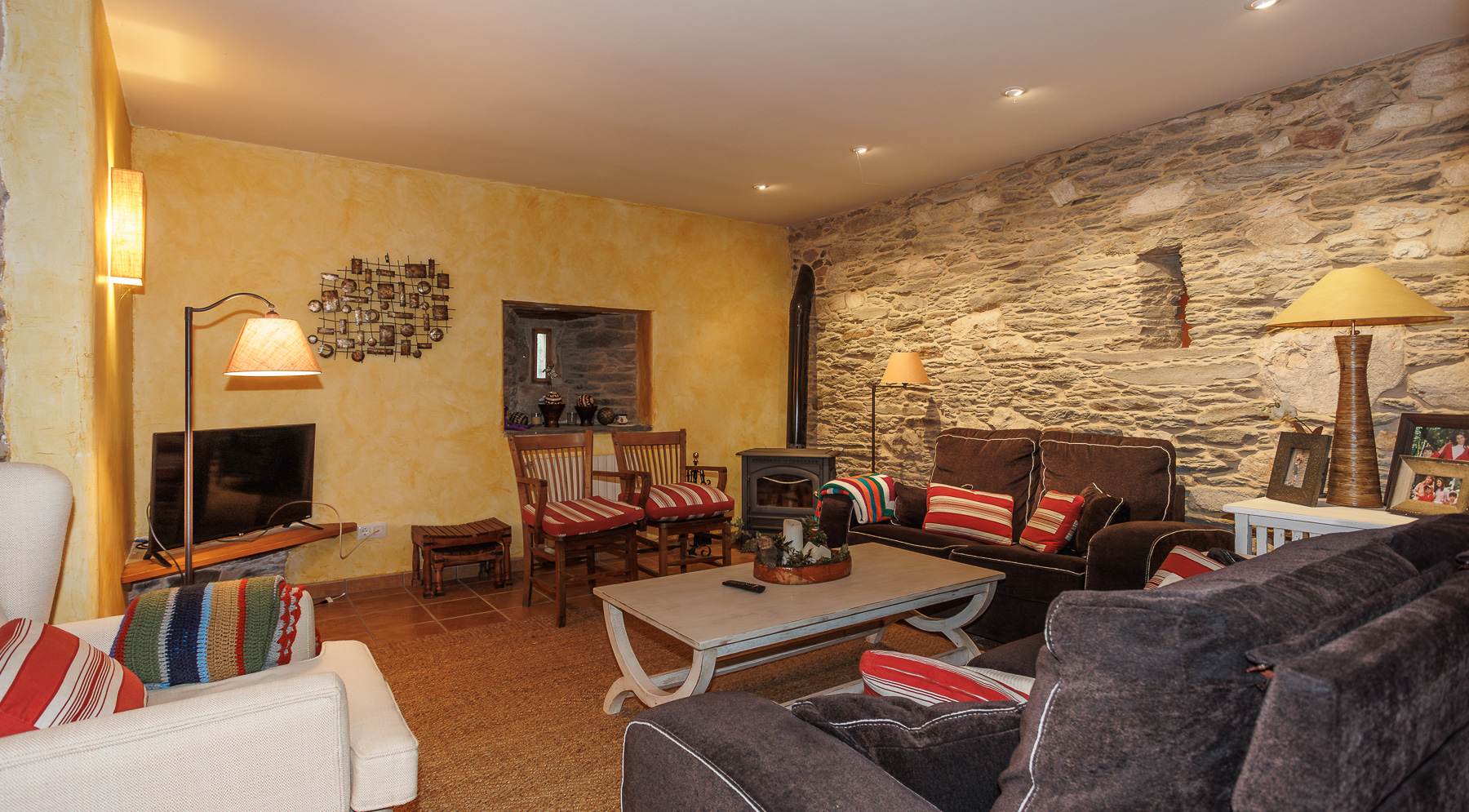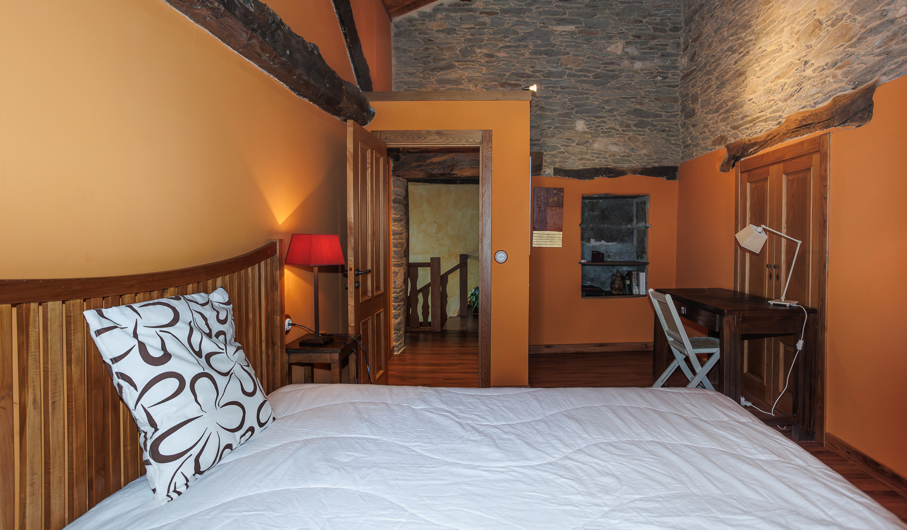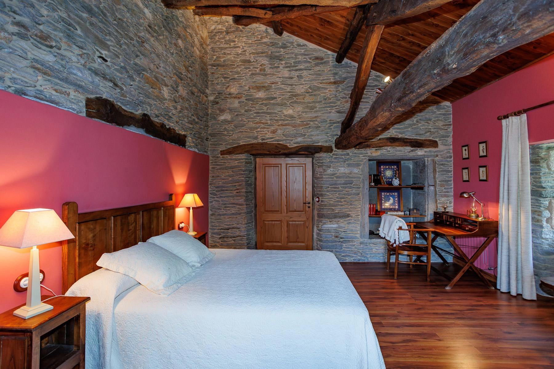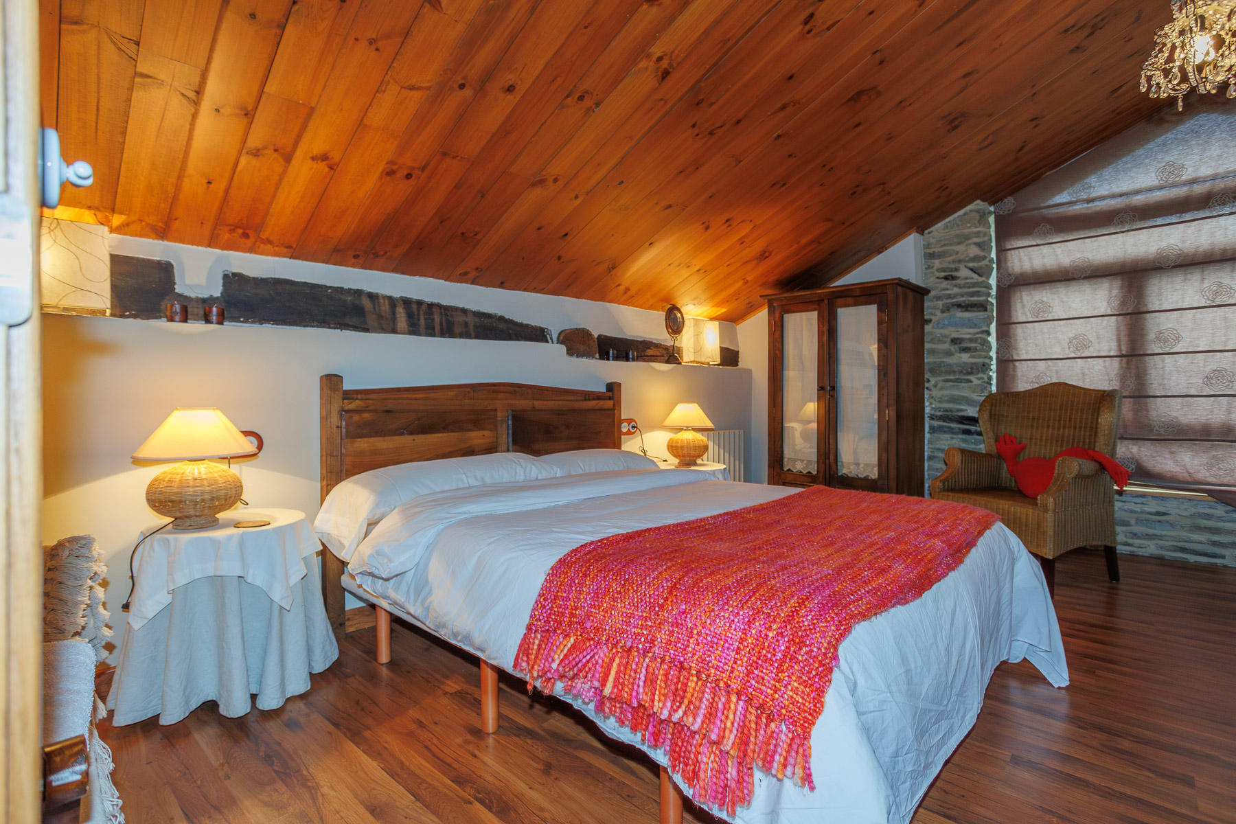 La vivienda principal destaca por su restauración ejemplar que combina elementos arquitectónicos tradicionales con acabados modernos de primera calidad. Los muros de piedra, las vigas de madera vista y los suelos de cerámica y tarima crean ambientes cálidos y acogedores en todas las estancias.