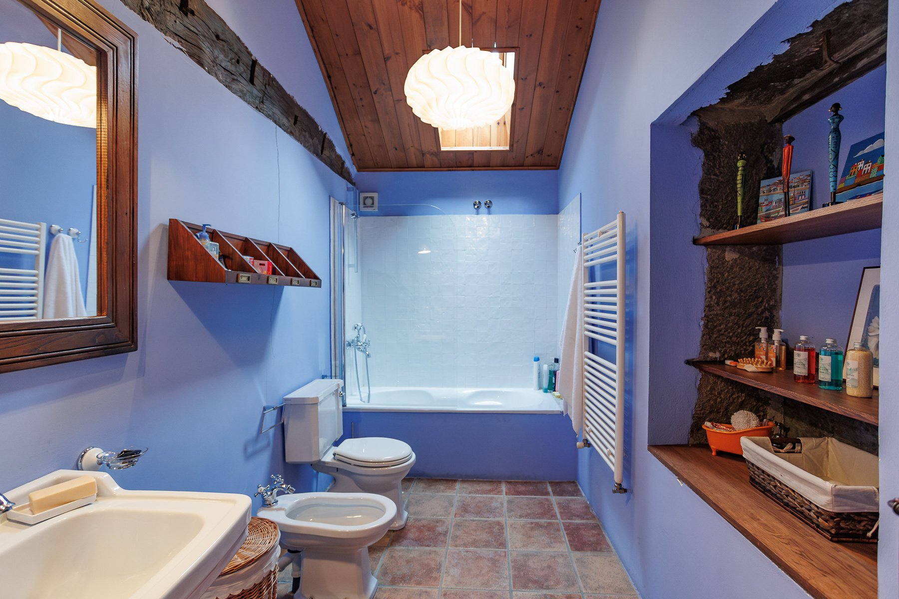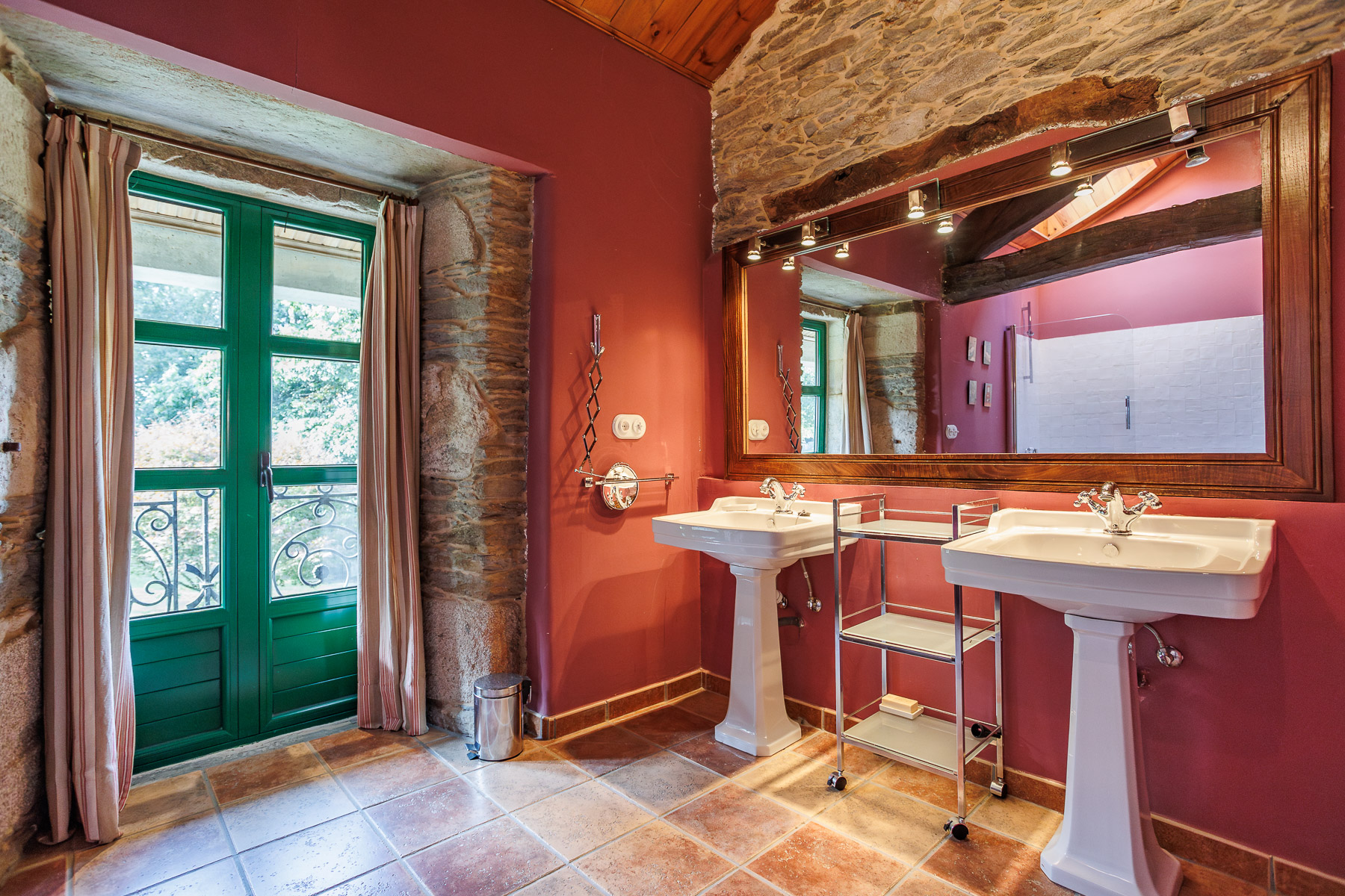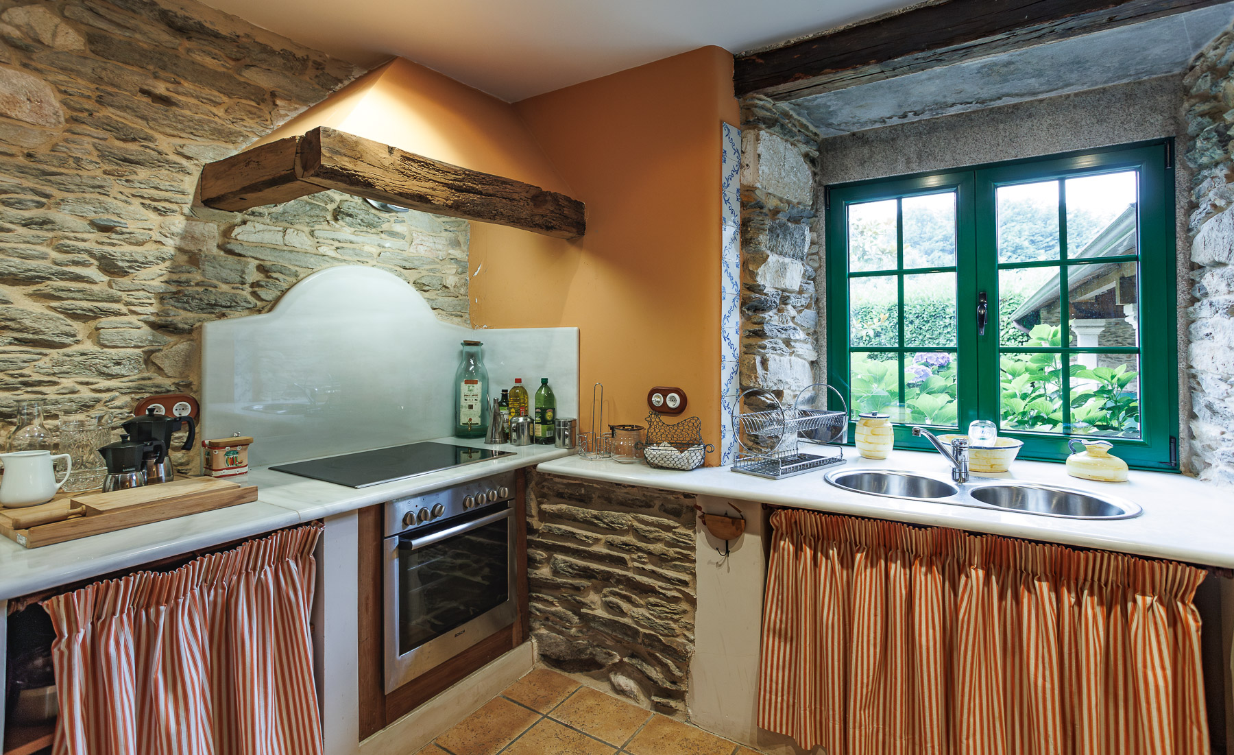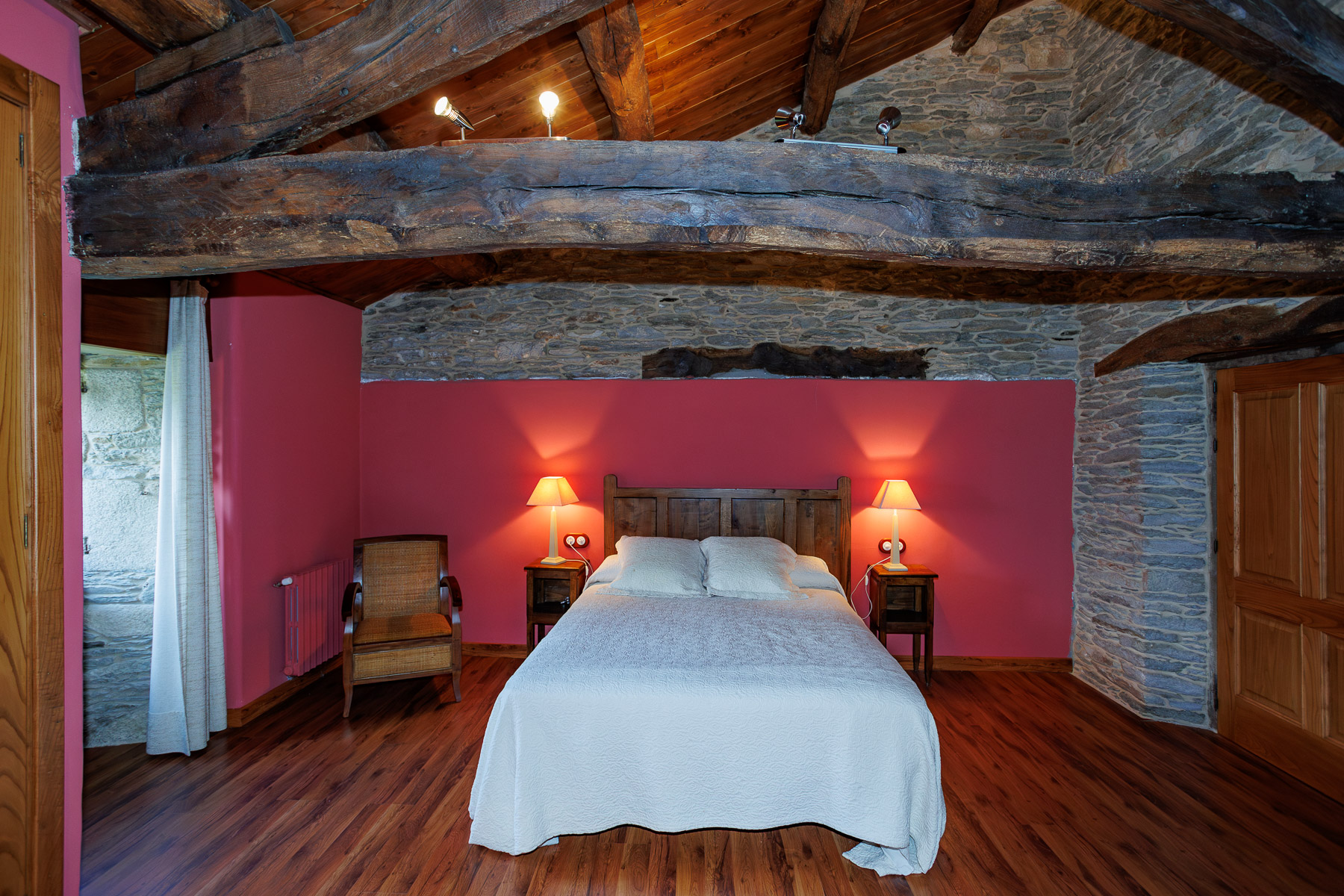 La vivienda principal destaca por su restauración ejemplar que combina elementos arquitectónicos tradicionales con acabados modernos de primera calidad. Los muros de piedra, las vigas de madera vista y los suelos de cerámica y tarima crean ambientes cálidos y acogedores en todas las estancias.