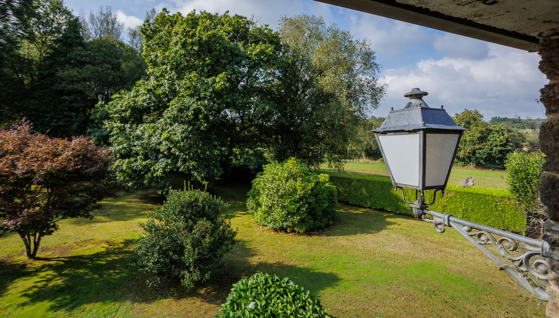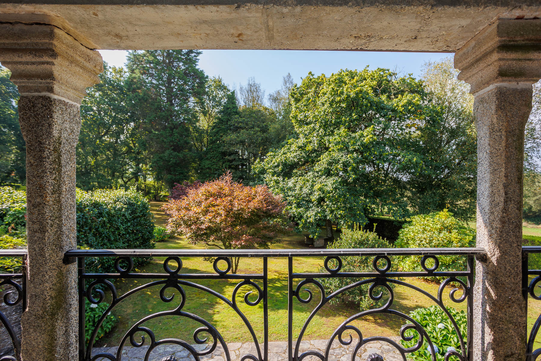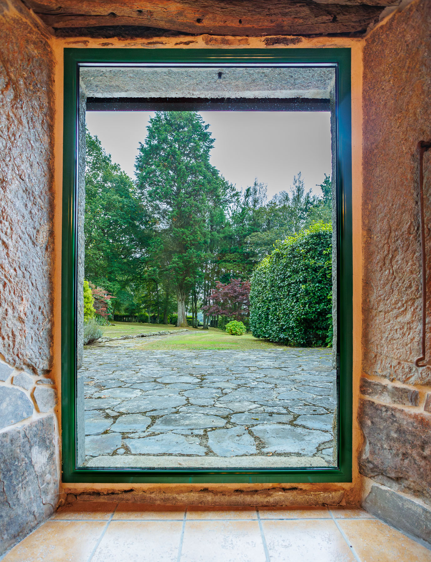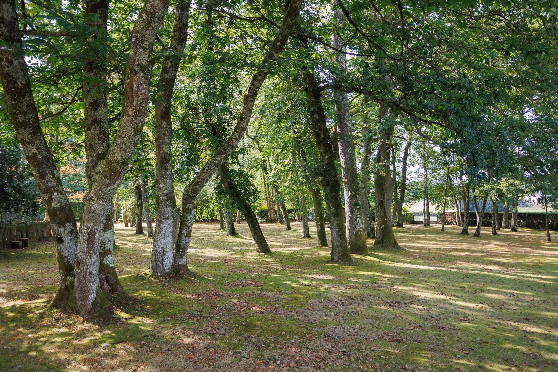 El acceso a la propiedad se realiza a través de una verja metálica que conduce directamente al bosque, con grandes árboles y suelo de musgo, que sirve de antesala a las diferentes construcciones y espacios exteriores que conforman la finca. Un muro de piedra cierra la propiedad en su totalidad, garantizando privacidad y seguridad.