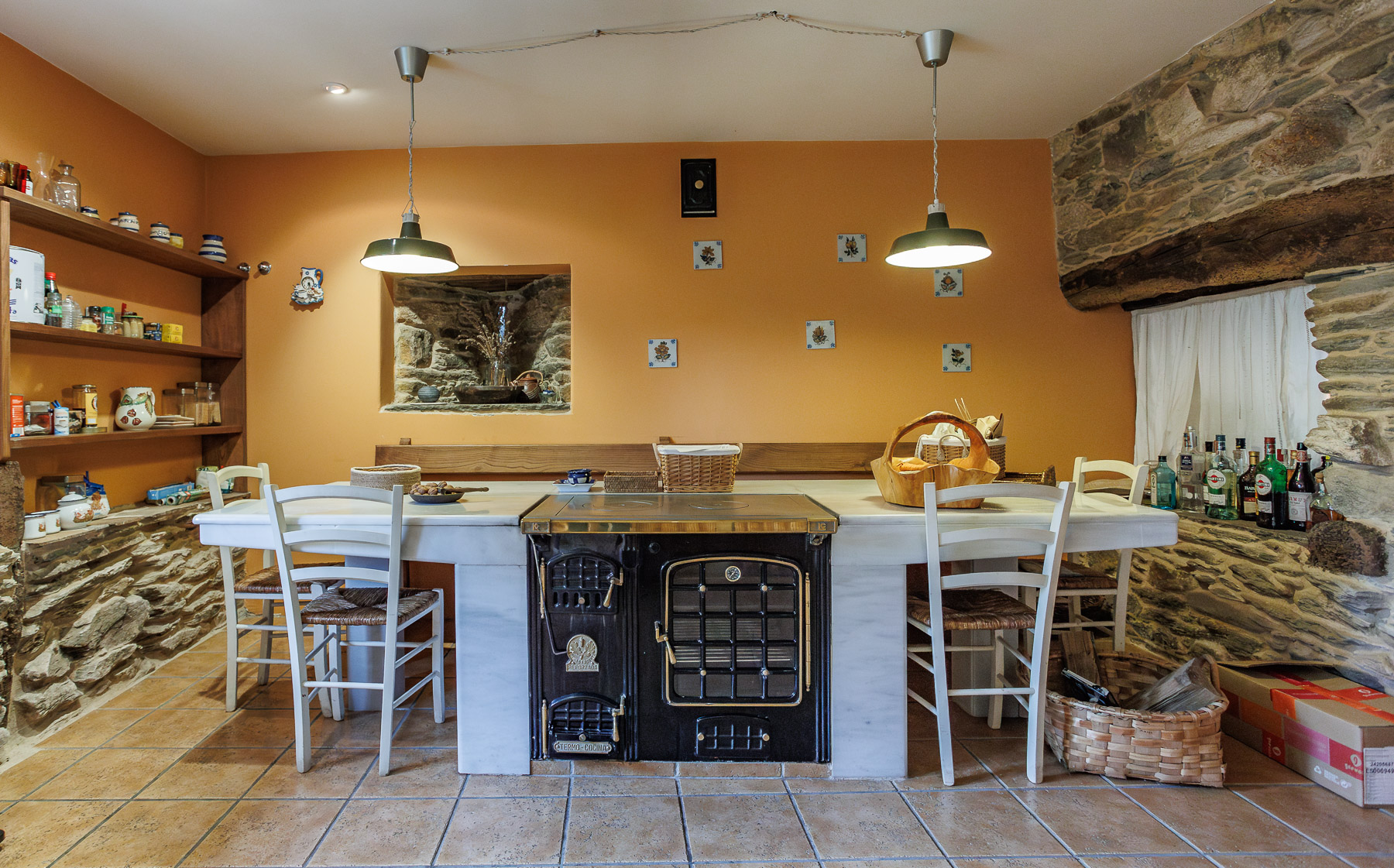 La casa se complementa con dos edificaciones anexas construidas en la misma piedra, que se integran a la perfección conformando un conjunto uniforme. A un lado, un gran alpendre de frente abierto que alberga un horno de leña. Al otro, un amplio garaje con capacidad para dos o tres vehículos, donde se encuentra la sala de calderas y una práctica sala de lavado-planchado.