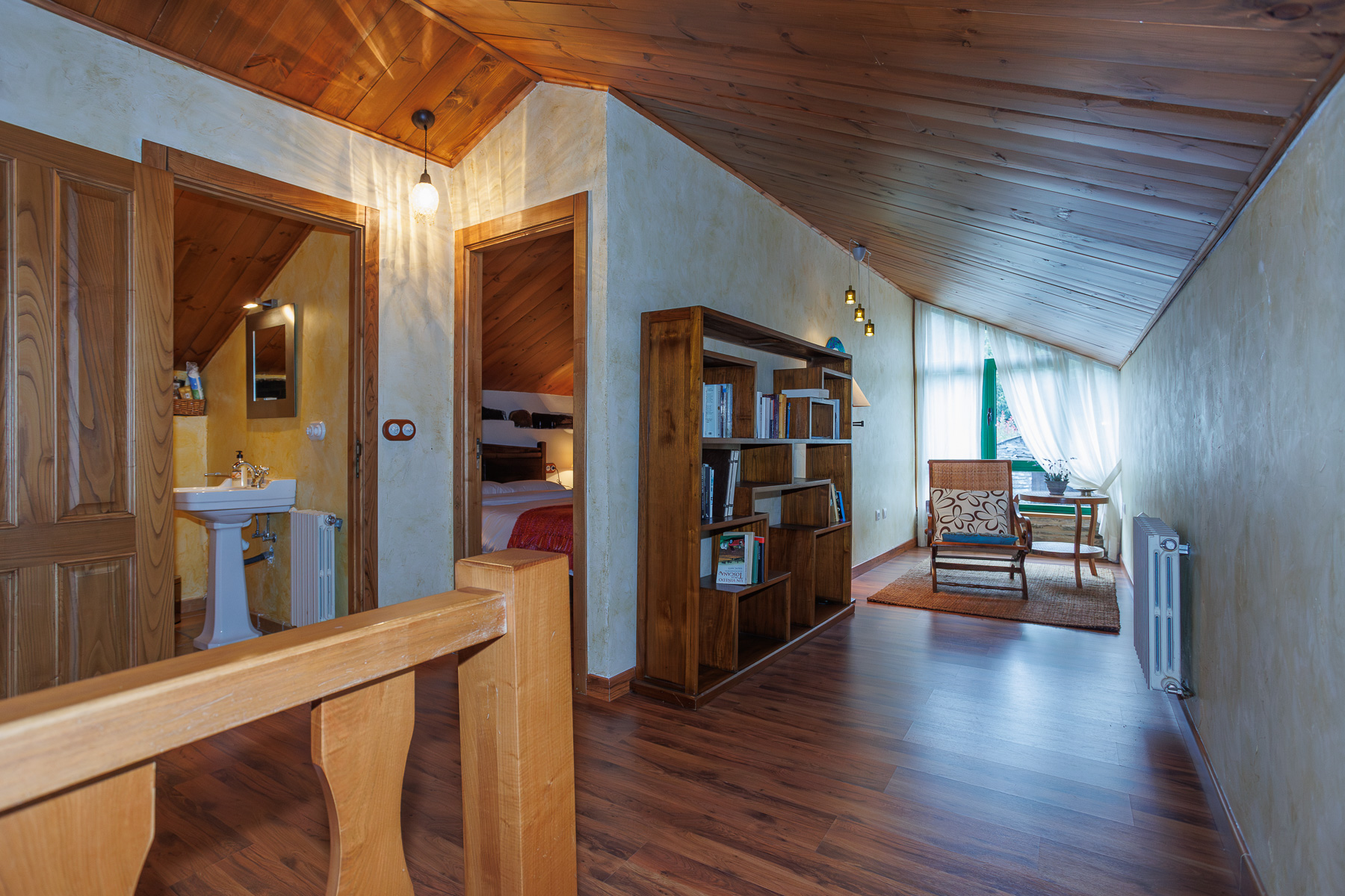 La planta superior alberga 4 dormitorios distribuidos en tres espacios diferenciados. El primer espacio es el dormitorio principal, que cuenta con un gran cuarto de baño y salida al amplio balcón con vistas al bosque y los jardines. El segundo espacio incluye una sala de estar con librería, una pequeña galería con vistas al jardín, un dormitorio doble y un cuarto de baño, mientras que en el tercer espacio se encuentran los dos dormitorios restantes.