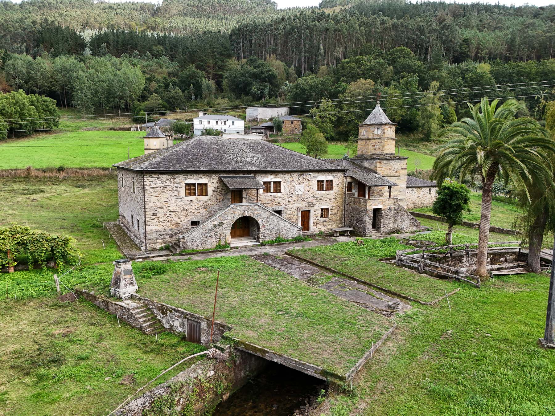 Este excepcional pazo gallego blasonado se encuentra en A Pontenova, en la comarca de A Mariña Occidental, provincia de Lugo. La propiedad se asienta sobre más de 3,3 hectáreas de terreno en un entorno natural privilegiado, rodeado de montañas verdes y atravesado por un río canalizado en piedra que aporta un valor paisajístico único.